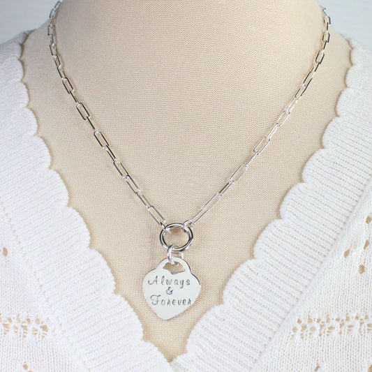 Sterling Silver Heart Pendant Paperclip Chain with Charmer Clasp - Always & Forever, Valentina grande