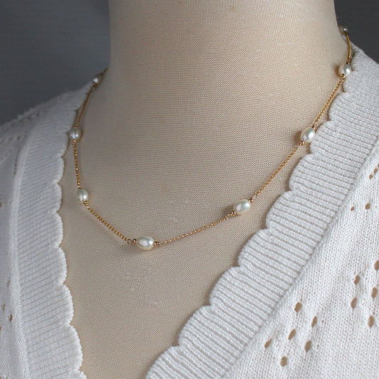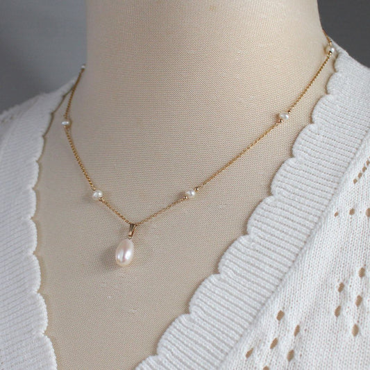 Pearl Drop Pendant on Pearl Station Chain Necklace - Gold - Muse