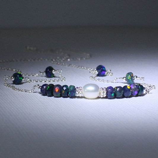 Black Opal, Pearl & Sterling Silver Necklace - Midnight Petal